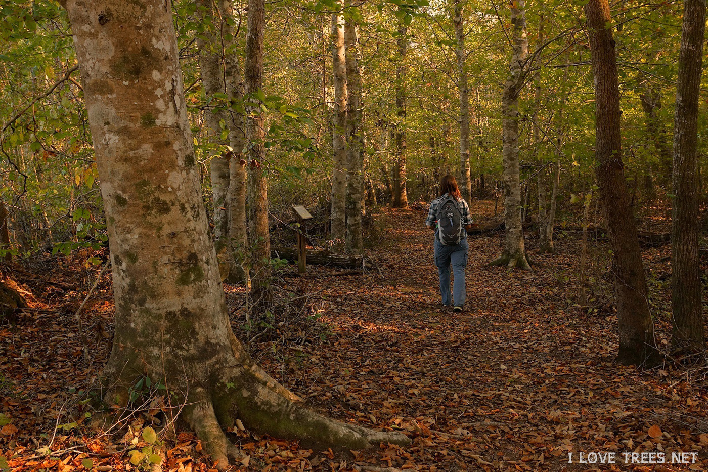 I started my walk along the Tulip Tree Trail. As the name suggests, there are several large tulip trees along this trail, cylindrical and tall with wide bases covered in emerald moss. Many of the trees are labeled for easy identification. There are also extended learning trails here with numerous information stations.